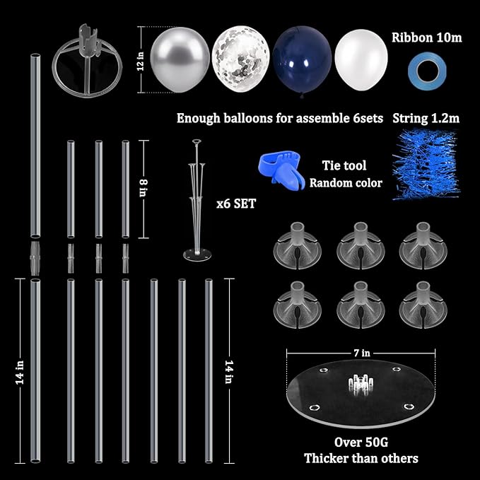 - WHAT INLCUDE: This balloon stand kit include 6 set balloon holders, 54 pcs balloons - blue silver white balloons, silver confetti balloons, 2 rolls ribbons, 2 pcs glue dots and 1 pc tie tool