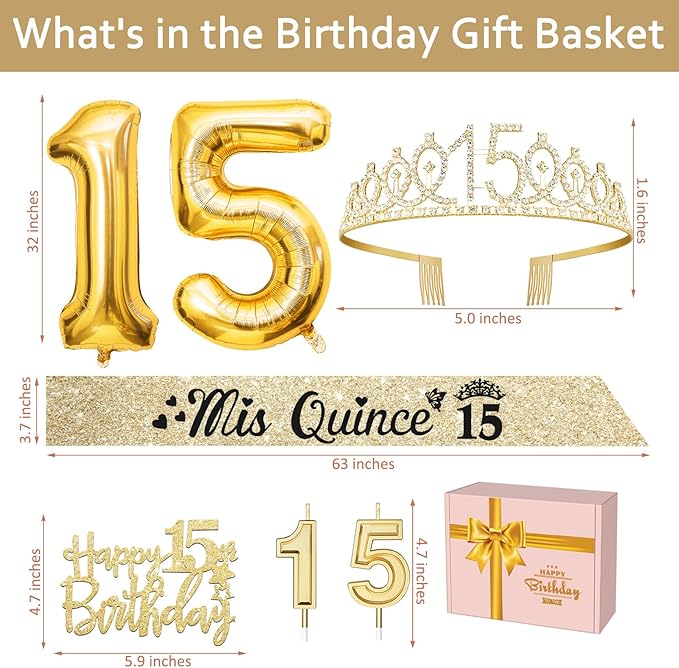 - Included Components : Gold 15th Birthday Tiara, Sash, Cake Topper, Candles, Balloons, Birthday Card, Gift Box