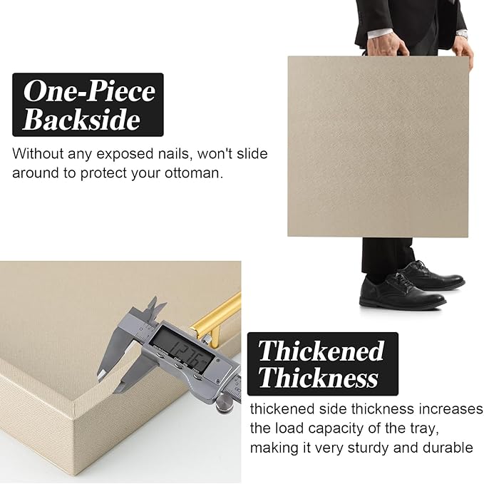 - Durable Leather Tray: Our trays are exquisitely crafted with high-end gold handles,The structure is made of 12mm thick medium density fiberboard, which is very sturdy and lightweight.The surface is made of gorgeous pearl cross grain leather, rich in rich textures, which looks very gorgeous and soft and smooth, and will not hook onto the surface of your footstool or other furniture.