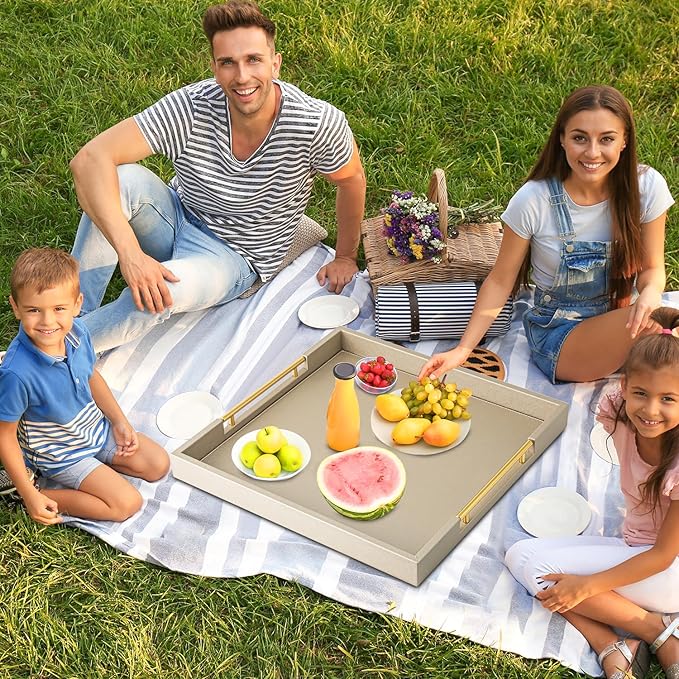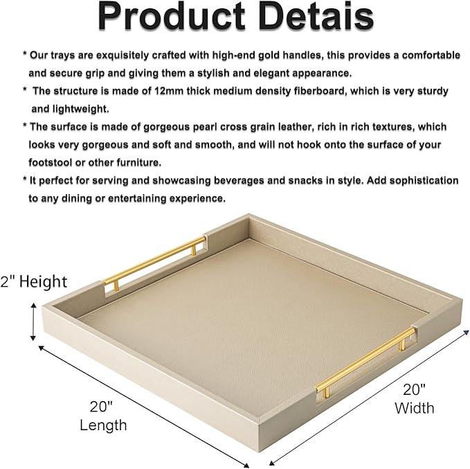 Champagne Faux Leather Serving Tray with Handles,20x20inches, Large Decorative Tray for Ottoman Coffee Table Decor Living Room, Kitchen, Bathroom
