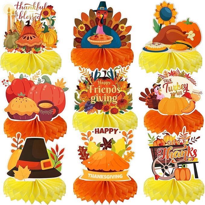 - Thanksgiving Centerpieces for Tables:you will receive 9 pieces different patterns thanksgiving honeycomb table centerpieces.Including pumpkins, turkeys, fruits, Maple leaf,these novel and cute decorations can bring a pleasant atmosphere to your thanksgiving party