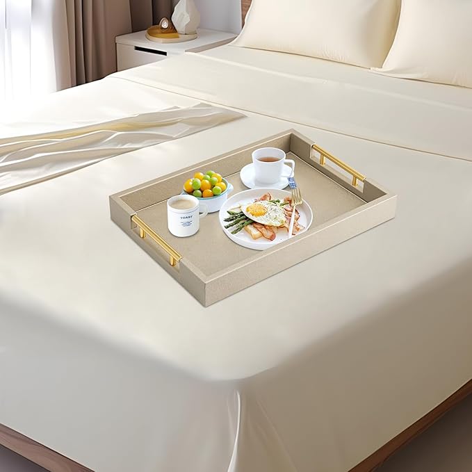 Champagne Faux Leather Serving Tray with Handles,17x12 inches, Large Decorative Tray for Ottoman Coffee Table Decor Living Room, Kitchen, Bathroom