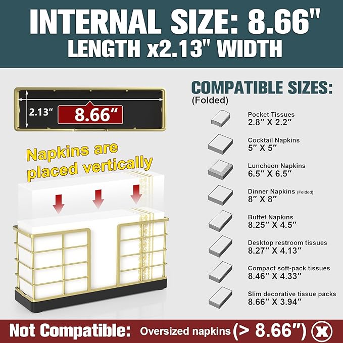 - Sized to Fit: The inner dimensions of the Bathroom Napkin Holder are 8.66" (length) x 2.13" (width), making it suitable for most standard guest towels and paper rolls. Napkins are stored vertically inside the holder, maximizing space and keeping them neat. It fits perfectly on the back of the toilet and is practical for year-round use