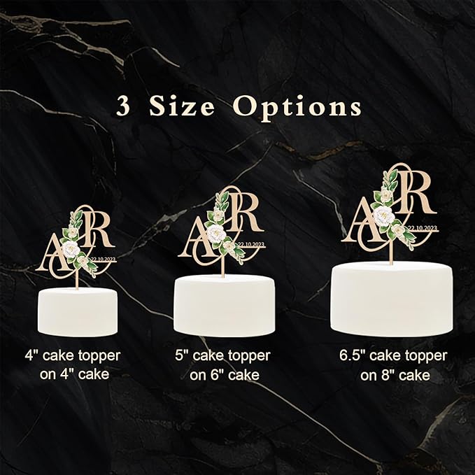 Personalized Wedding Cake Topper in Wood Custom Initials & Date Wedding Cake Decoration Printed with Flowers & Green Leaves