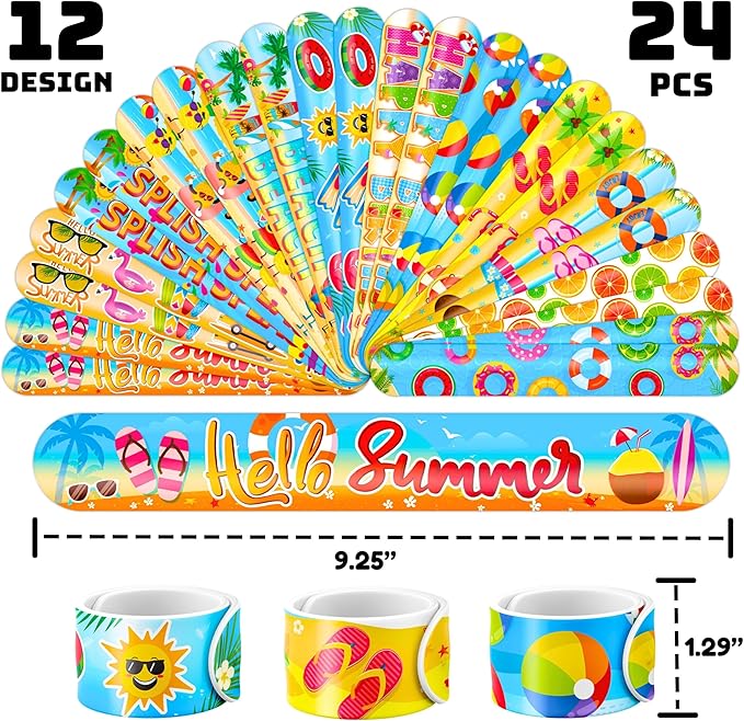 - 🥳【DELIGHTFUL BEACH PARTY FAVORS BUNDLE】: Get ready for laughter with our set of 24 temporary pre - cut tattoo and 24 slap bracelets. Each piece showcases vibrant and adorable designs inspired by the Beach theme. Perfect for both kids and adults, this bundle ensures endless fun. The bracelets measure 23.5cm x 3.3cm, providing a satisfying "slapping" experience as they effortlessly wrap around your wrist.