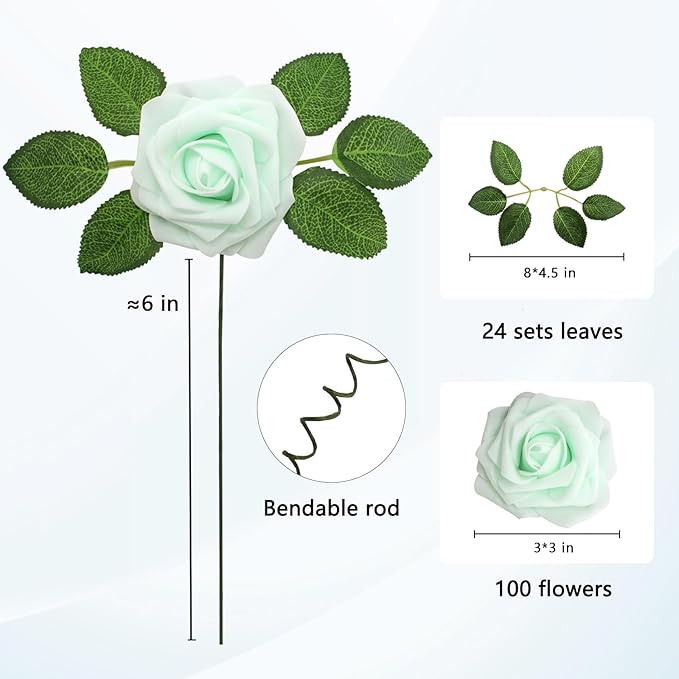 - [ QUANTITY & SIZE ] -- There are 100pcs fake roses and 24pcs leaves in each package. Rose Head is around 3 inches, Stem is around 7 inches. The Gifting box is a clear transparent window design, it's a very decent and beautiful package for presents.