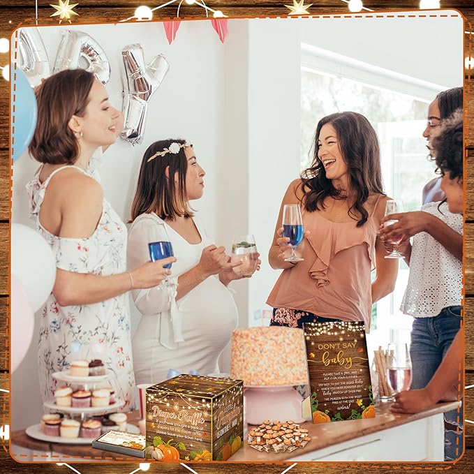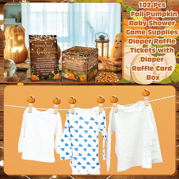 - Package Includes: this pumpkin baby shower party game comes with everything you need to add fun and engagement to the event; The package contains 1 sturdy pumpkin theme diaper raffle box, 50 diaper raffle tickets, 1 adorable 'don't say baby' sign, and 50 pumpkin wooden clothespins; It's a memorable baby shower