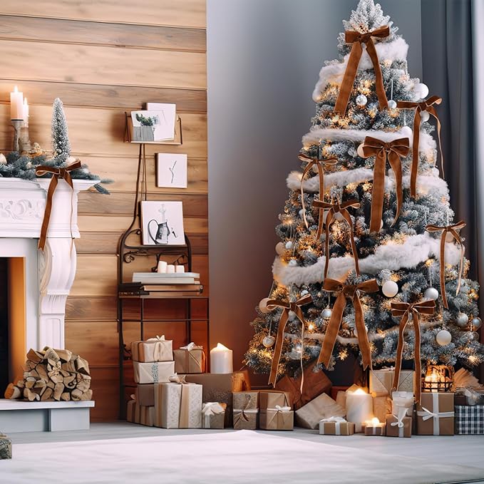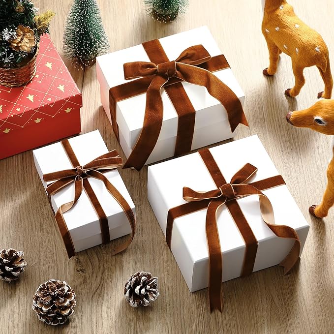 Yilloog 3/8'' 5/8'' 1'' 90 Yards Christmas Velvet Ribbon Vintage Satin Fabric Velvet Ribbon Roll for Christmas Tree Ornaments Decoration Gift Wrapping Bow DIY Crafts (Brown)