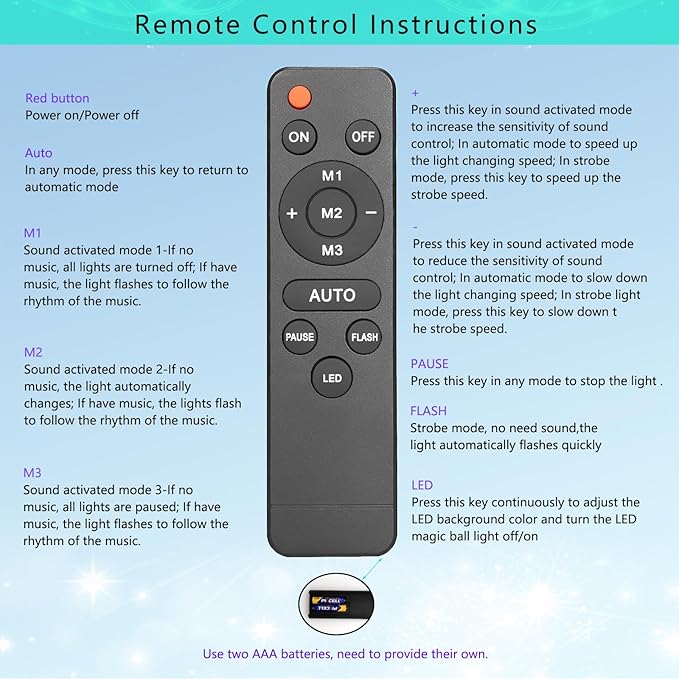 - Sound -activated party lights: Disco ball lights are composed of 3 RGB DJ lights+red and green laser pattern projection lights. Three sound control mode can be selected. Different music can be matched with different modes to easily add an atmosphere to the party and nightclub.