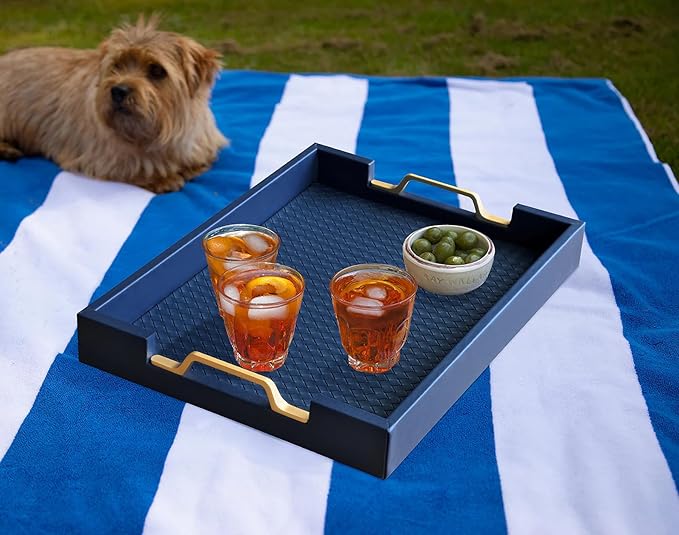 - Versatile: This sleek serving tray offers a convenient surface for serving drinks, snacks, or displaying decorative items. Great tray for serving your favorite foods and beverages atop your ottoman or coffee table; Boasts an ample serving area with high sides and gold metal handles.
