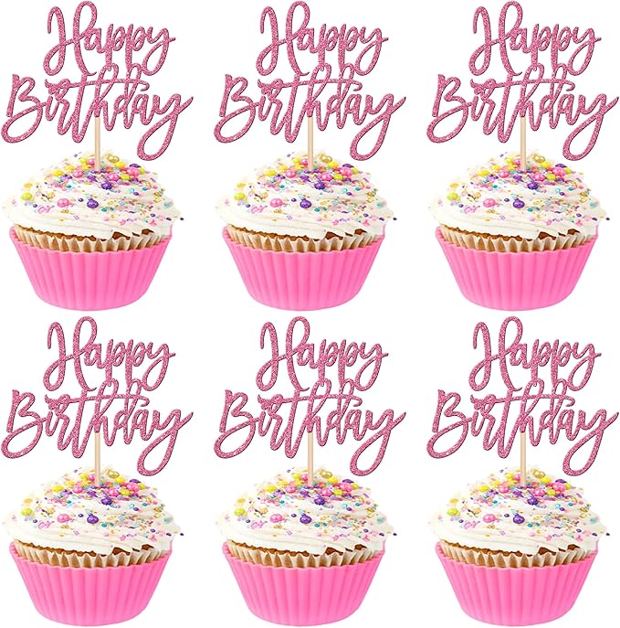 24 PCS Glitter Cupcake Toppers - Happy Birthday & Anniversary Picks - Pink