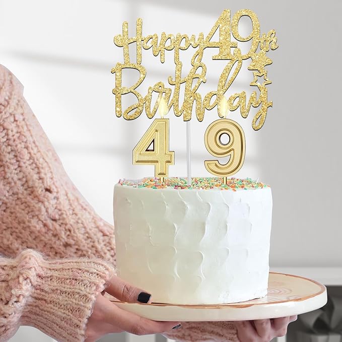 - 49th Birthday Cake Topper and 49 Candles: Gold 49th Birthday Candles in Number 4 and 9, and 1Pc Gold Glittery Happy 49 Birthday Cake Topper that are elegant prop to embellish your cake and cupcake. These dreamy golden 49th Birthday Kit help to create a romantic and elegant 49 birthday celebration. A classical birthday card included will good help to write your love word to the 49 year old women