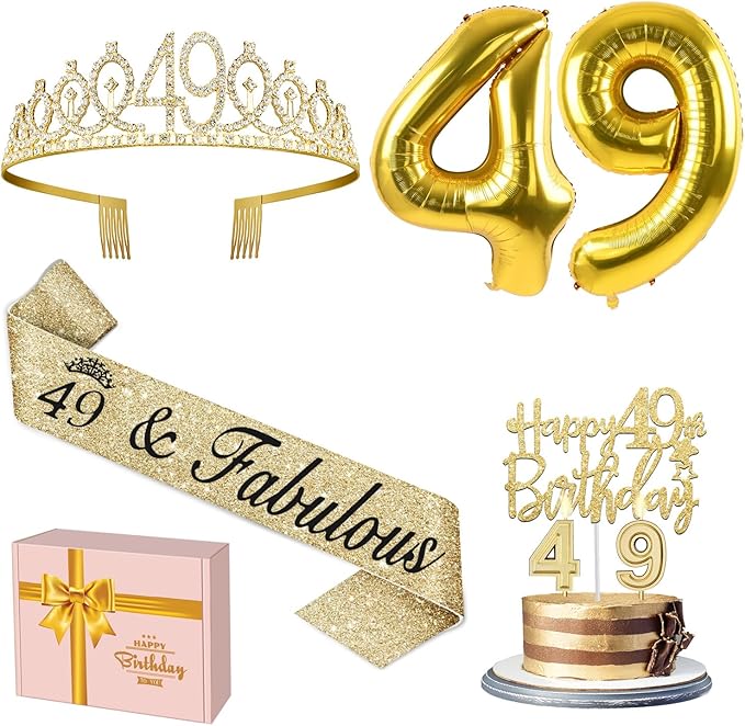 - 49 Birthday Decorations Gold Set: Package Coming with Glittery Rhinestone 49th Birthday Tiara/Crown x 1pc, 49th Birthday Sash x 1pc, Happy 49th Birthday Cake Topper x 1pc, Number 49 Candles x 1set, Big Gold Numeral 49 Balloons x 1 set, Birthday Card x 1pc. This great valuable 49th birthday gift for women gold has been packed in a beautiful gift box for ready presentation