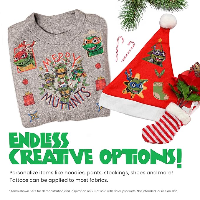 - GET CHEERY WITH THE TURTLES: Celebrate the festive season with the Teenage Mutant Ninja Turtles - Mutant MayhemSweater Fabric Kit Iron On Alternative like Temporary Tattoos. These fun and vibrant tattoos are perfect for fans of the Turtles who want to add a touch of holiday cheer to their look.