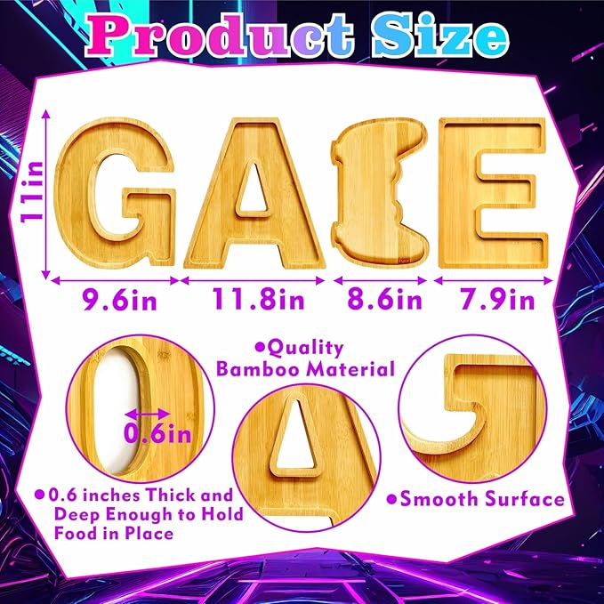 - GAME Charcuterie Boards total contain: 4 wooden of 1 set trays shaped like "GAME"letters.X-size: 11’’H x 9.69’’W,"M-size: 11.8’’H x 11’’W,A-size: 11’’H x 8.66’’W,S-size: 11’’H x 7.95’’W,The thickness of each letter is 0.59 inches