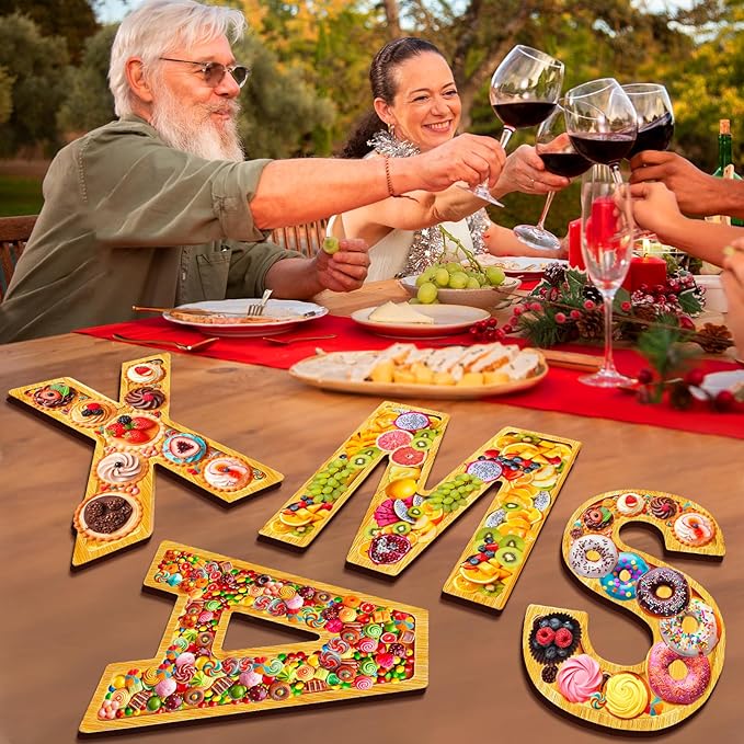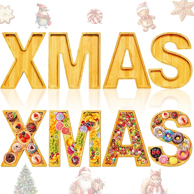 - XMAS Charcuterie Boards total contain: 4 wooden of 1 set trays shaped like "XAMS"letters.X-size: 11’’H x 10.7’’W,"M-size: 11’’H x 11’’W,A-size: 11’’H x 10.8’’W,S-size: 11’’H x 9.6’’W,The thickness of each letter is 0.59 inches