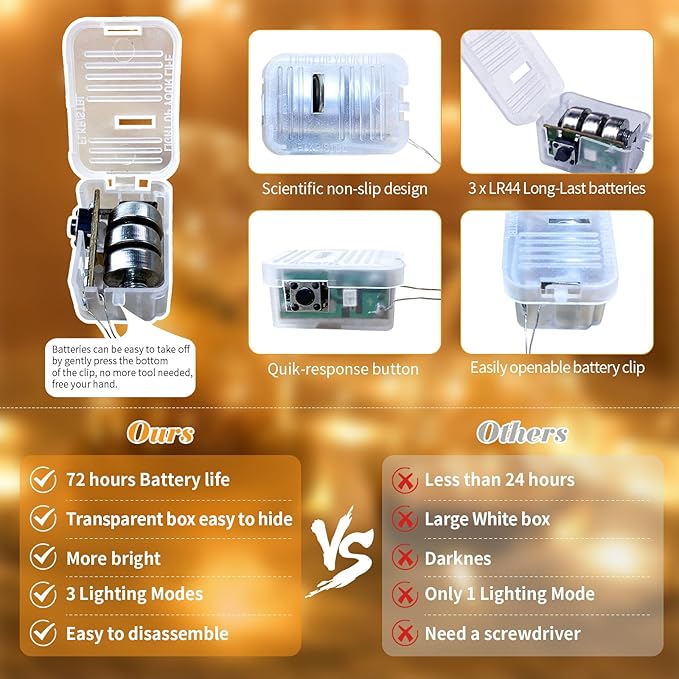 - UPGRADED DESIGH AND EASY TO REPLACE: The fairy lights' newest clear and small battery box is 0.78*1.3 inches in size, very easy to hide into all your DIY projects. The upgraded battery pack has scientific non-slip design on both sides, which makes it feel comfortable and easy to catch. Batteries are also very easy to take off, no more screwdriver needed, just gently press the bottom of the clip to open, free your hand