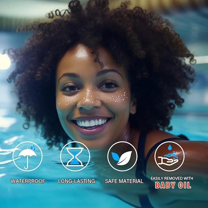 - Waterproof and Long-lasting Glitter Freckles Face Tattoo: Our makeup patches are waterproof, sweatproof and long-lasting, perfect for going out for a run or a swim, or attending a concert or birthday party, etc. They will last all day without worrying about peeling off.