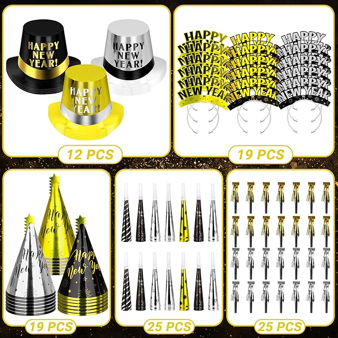 - Included Components : 12 × New Years Top Hats, 19 × NYE Party Hats, 19 × New Years Eve Party Headbands, 25 × NYE Noise Makers, 25 × New Years Eve Horns 12 × New Years Top Hats, 19 × NYE Party Hats, 19 × New Years Eve Party Headbands, 25 × NYE Noise Makers, 25 ×… See more