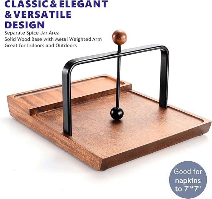 - Durable and High-Quality Construction: Crafted from premium wood with a sturdy wood base, this napkin holder for kitchen is designed to last. The natural wood is complemented by metal arms that ensure stability and durability, while the smooth finish adds an elegant touch. Rubber feet on the base prevent slipping and protect your surfaces from scratches, making it suitable for both indoor and outdoor napkin holder use.