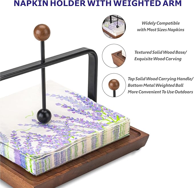 - Premium Craftsmanship for Durability: Crafted with precision from high-quality walnut-colored wood and complemented by a sturdy black metal weighted arm, this black napkin holder is designed for long-lasting use. The metal arm ensures that your napkins stay securely in place, even during outdoor events or windy conditions. The wooden base is equipped with rubber pads to prevent slipping and protect your surfaces from scratches, ensuring durability and stability.