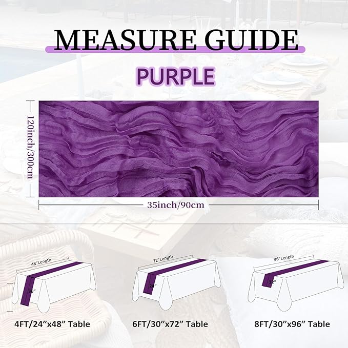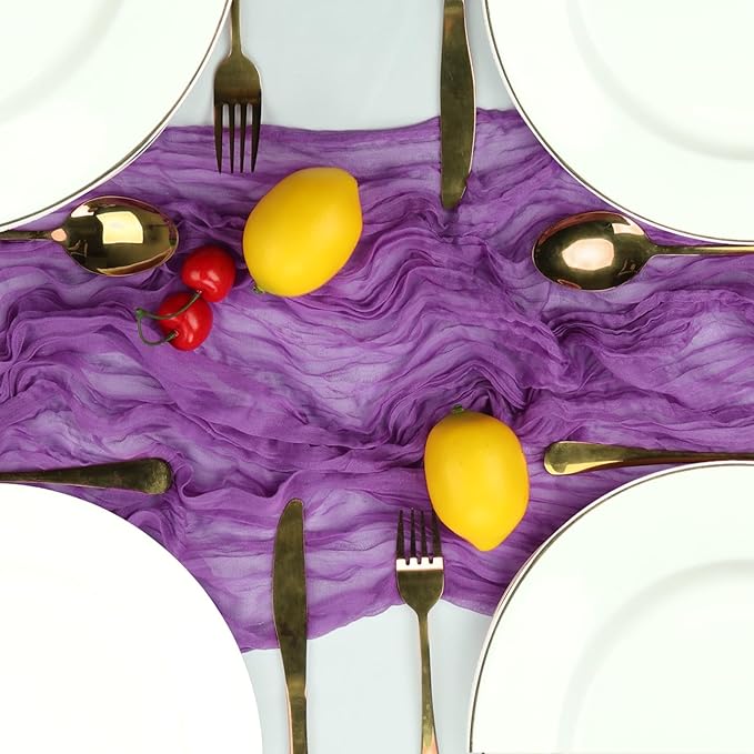 - 【Easy to Care】These purple cheese cloth table runner are skin-friendly and recommended for hand wash in cold water with mild detergent or machine wash in a laundry bag. In order to keep its crinkling texture, please do not iron it or use fabric softeners. For a long time use, please hung them up to dry, avoid bleaching or drying in direct sunlight, or their color may fade.