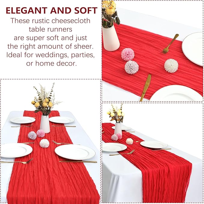 - 【Perfect Looking】These cheese cloth table runner are made from polyester fabric with beautiful wrinkles, which is reusable, flexible and tear resistant. Thanks to natural material and exquisite workmanship, red table runner are lightweight, soft and comfortable to touch, no pilling and no fading. The rustic boho style with delicate edges and stitches will make your events more romantic and elegant.