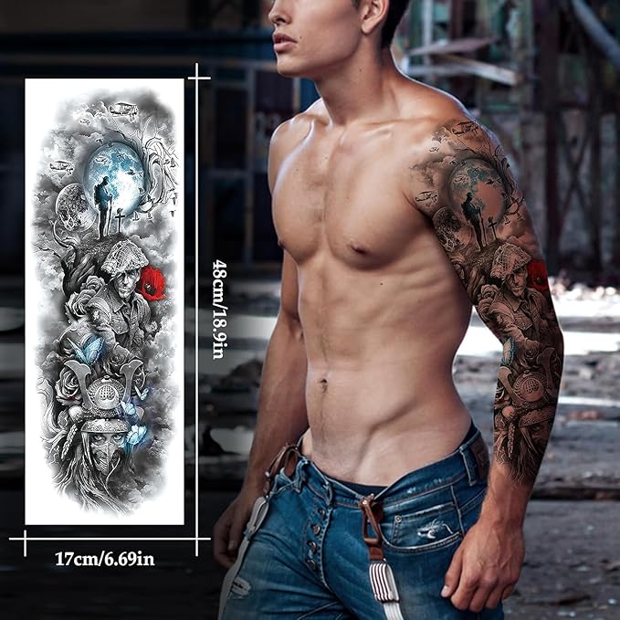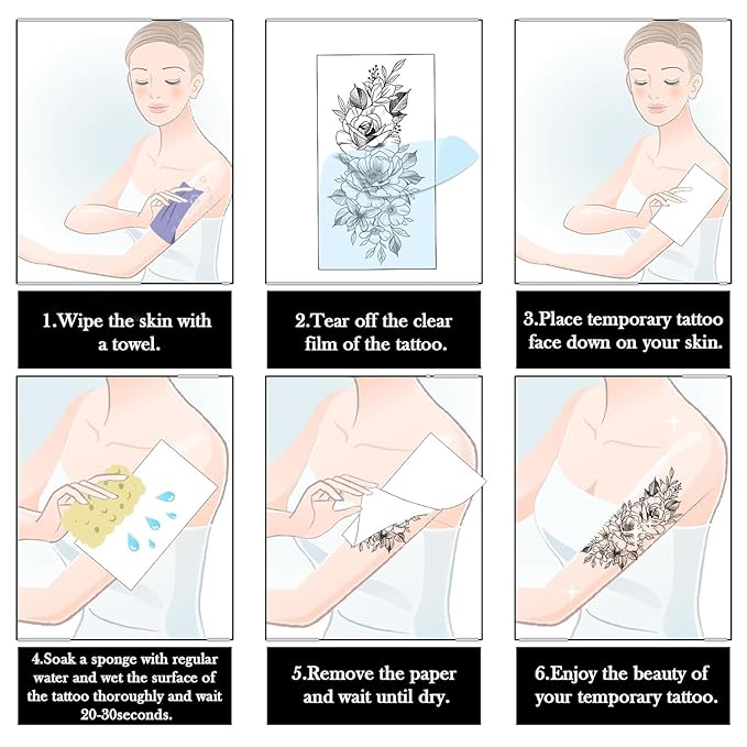 - Quick & Easy Application:Applying these tattoos is simple! Just remove the clear film, place the tattoo on clean, dry skin, press with a damp paper towel for 15 seconds, and peel off the backing. Let it dry, and you’re ready to show off your realistic, full arm body art