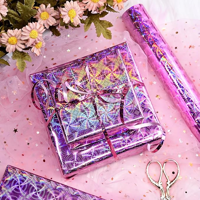 - MINI ROLL PAPER: The holographic shiny gift wrap paper come with a roll of 17" x 33ft, providing you with a total of 46.8 Sq Ft of paper, enough to wrap small and medium gifts. Please confirm gift size BEFORE placing order