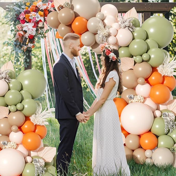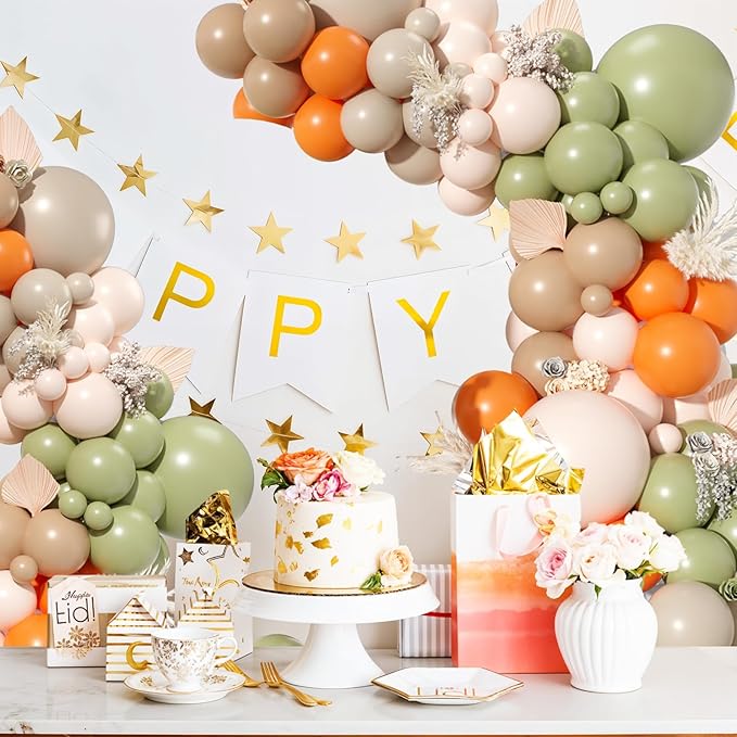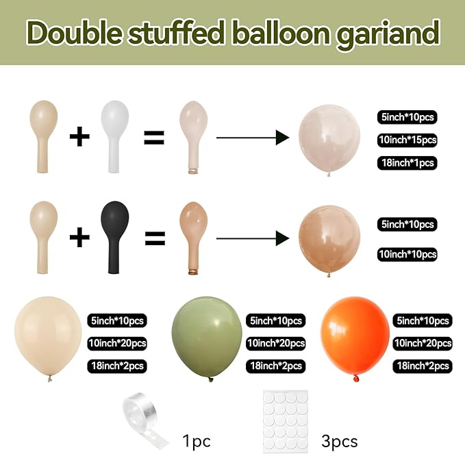 - Sage Green Pink Balloon Garland: includes avocado green balloons(5"10pcs+10"15pcs+18"1pcs), dusty pink balloons(5"10pcs+10"10pcs+18"1pcs), macaron yellow balloons(5"10pcs+10"15pcs+18"1pcs), macaron orange balloons(5"8pcs+10"15pcs), sand white balloons(5"10pcs+10"10pcs), 1 * balloon chain, 3* dispensing. If you want to make a rich balloon garland, 2 packs of dusty green pink yellow balloon kits can create a larger party scene well.