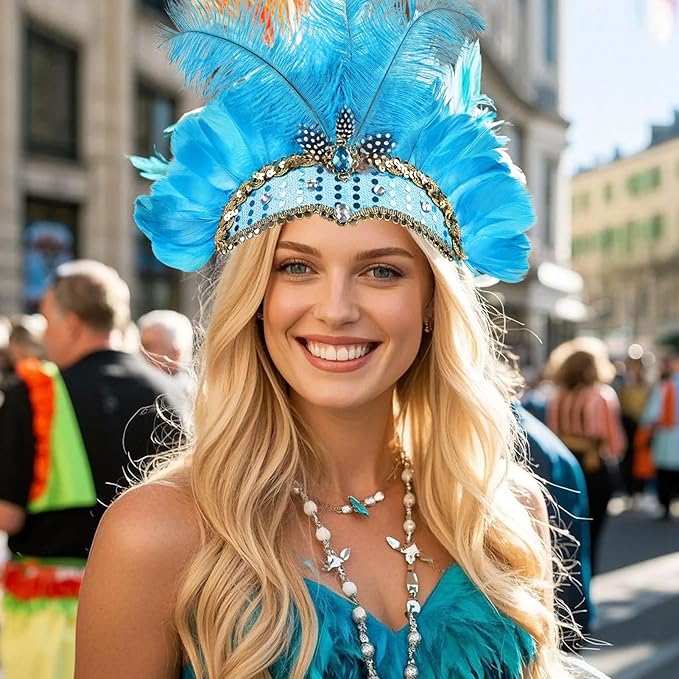 - Multiple Occasions:These sequin feather headdress can be paired with any style of clothing, perfect for Carnivals,Caribbean Parade,Halloween,Weddings,birthdays, parties,dances and any other retro style occasion. Add elegance and charm to your look