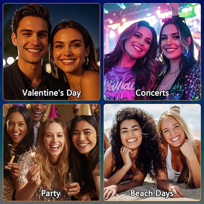 - Versatile Use: Get these face glitter freckles, designed to help you achieve a stunning look for any occasion such as on a girls trip, weeding, bride after party look, concert, Birthday party, Elsa costumes or any costume events, cosplay, homecoming dance, bachelorette party, Halloween party, music festival, summer party, cotton ball, Girls night, sleepovers, beach weekend, bachelorette/bridal parties