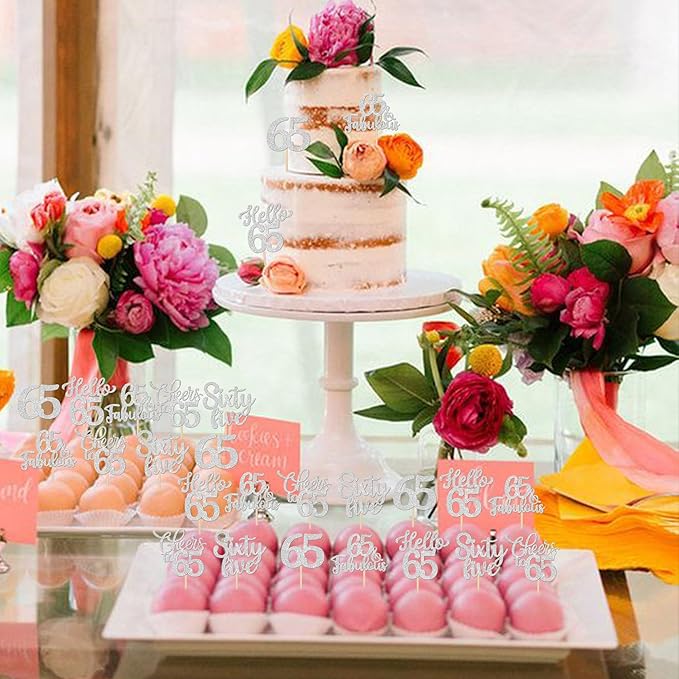 - Wide Usages ! These 65th birthday cupcake toppers are perfect for happy 65th bithday theme party, hello 65 theme birthday party, 65th wedding anniversary theme party,cheers to 65 years theme party cupcake decorations, they can make your cupcake more attractive and bring the fun to your party.You can also apply them for ice cream, fruits, cookies and other desserts.