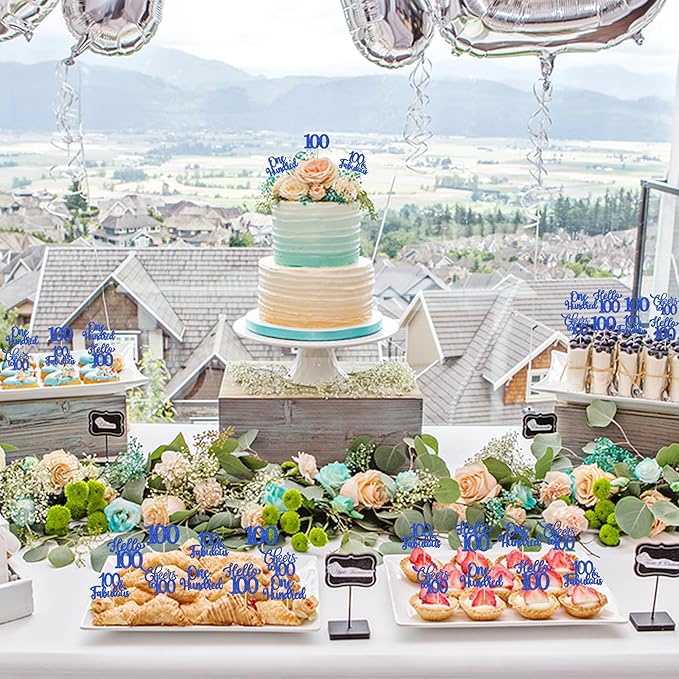 30PCS Happy 100th Birthday Cupcake Toppers One Hundred Cheers to 100 Years Birthday Cupcake Picks Hello 100 Fabulous Cake Decorations for Happy 100th Birthday Anniversary Party Supplies Blue