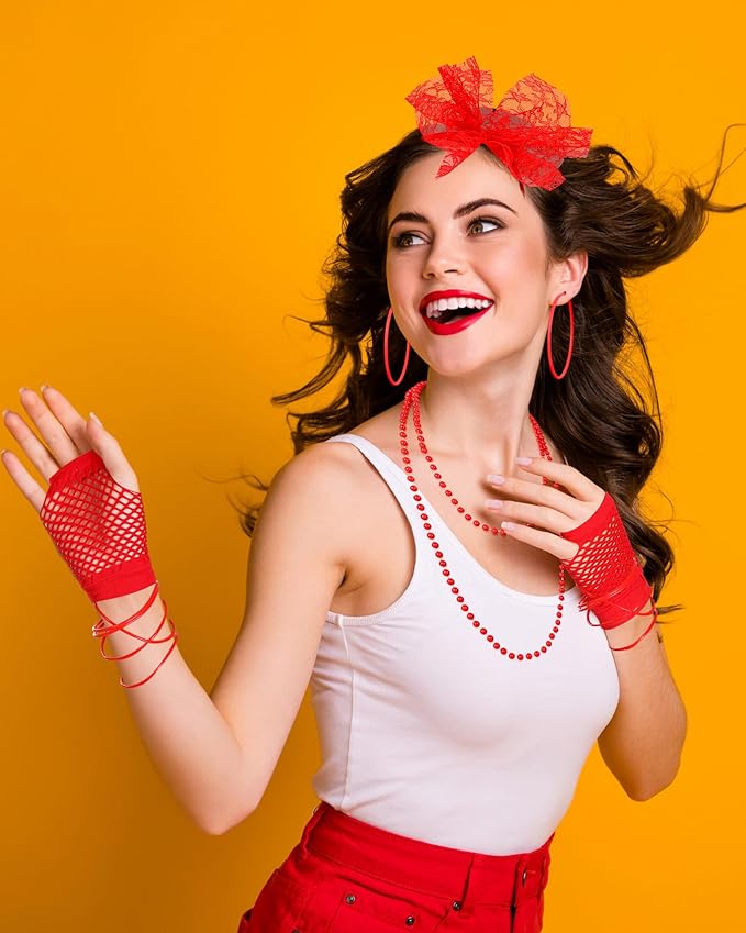 - Package includes: 80s party supply includes 1 pair fishnet gloves, 1 pair vintage earrings and 1 piece headband, 1 piece necklace and 10 pieces silicone bracelets; Meet you demands for 80's costume accessories and Halloween