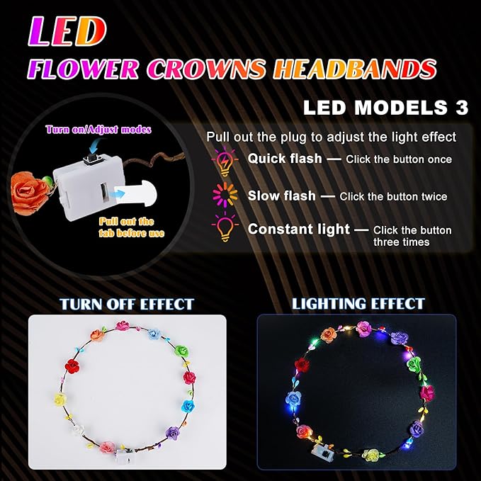 - ✨3 Flash Mode Light Up Headband: The flower headband needn't extra batteries! Simply remove the insulating tab and press the button to activate. There are three light modes for your free choice: fast flash, slow flash and constant light