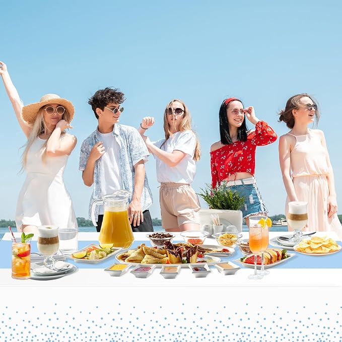 - Party Theme Application: White and light blue polka dot tablecloth design can be well matched with various entertainment scenes, suitable for birthday theme parties, children's parties, baby shower, outdoor activities, barbecue parties, picnics and so on