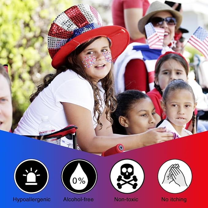 - PATRIOTIC FACE GLITTER HEADBAND KIT --- The Happy Fourth of July Star Set includes a festive star headband and vibrant red white and blue glitter, perfect for adding sparkle to your face, body, and hair.USA Flag body glitter gel contains net 36g/pack