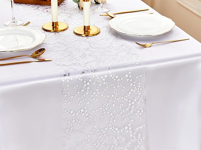 - 【Silver Table Runner】1 PCS. Size: 11" wide x 16.4 ft long(28cm x 500cm). The organza fabric is hot-stamped with silver stars. It can meet the daily use needs of most of your dining tables and make your dining table more stylish.