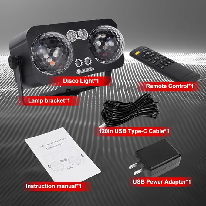 - Disco Ball Party Light Packaging List: Disco ball lighting including led party lights with 2 magic disco balls x1,Remote Control x1,UL Safe Charger x 1,Bracket x 1,10ft USB Cable X 1,Instruction Book x 1 :You can install discoball on the ceiling, wall or place it on the desktop, we provide an extra-long 10ft USB cable with a UL plug, enabling more convenient use in various venues.