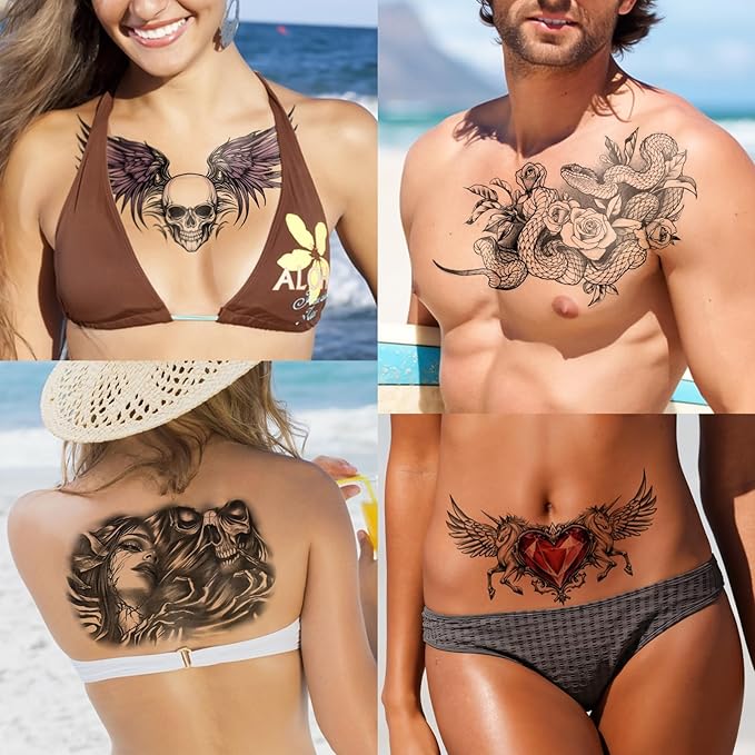 - Unique Design Chest Underboob Temporary Tattoo: Yazhiji chest Fake Tattoo were not only super cool, but also a symbol of strength, passion, and determination, reflecting strength, bravery and courage, chest themes tattoos symbolize the spirit of freedom, adventure and rebellion.