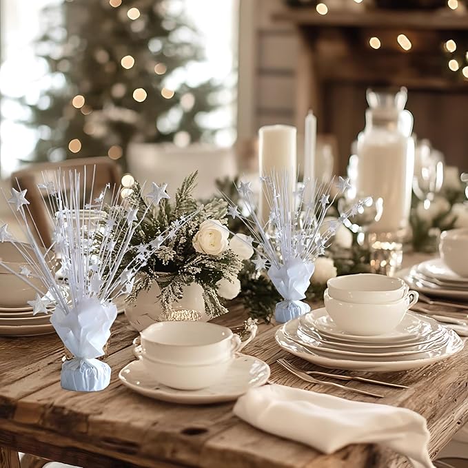 - [White Foil Star Party Decoration] The package will arrive with 12 pieces cute white stars brust table centerpieces, this party table decor set is really good for decorating your planned party holiday, especially birthday, wedding, anniversary etc. And the quantity of the set is enough for give you a whole decoration.