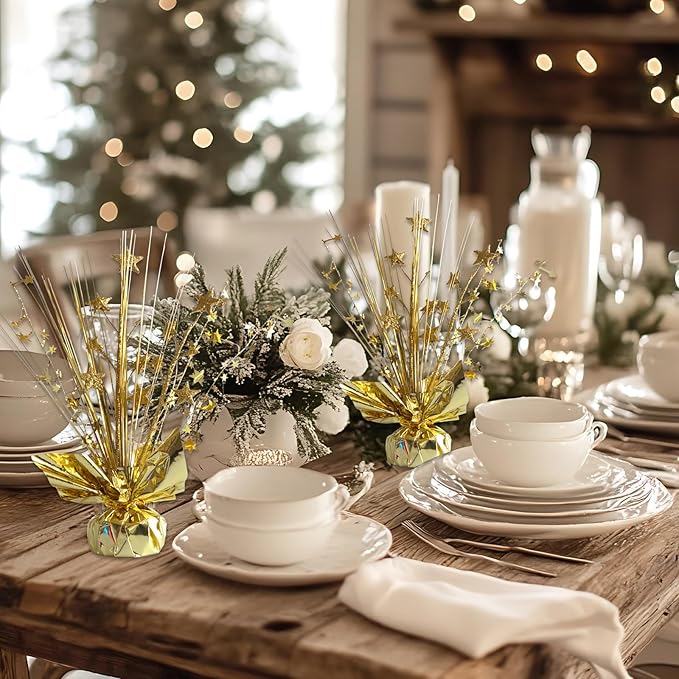 - [Metallic Gold Foil Star Party Decoration] The package will arrive with 12 pieces metallic shining stars brust table centerpieces, this party table decor set is really good for decorating your planned party holiday, especially birthday, wedding, anniversary etc. And the quantity of the set is enough for give you a whole decoration.