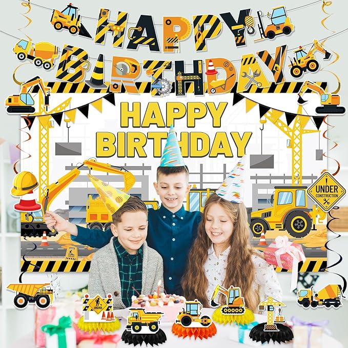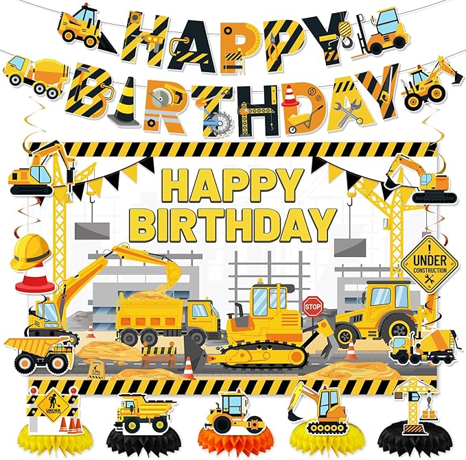 Construction Birthday Party Supplies, Truck Theme Party Decorations Include Happy Birthday Banner, Backdrop, Hanging Swirls, Honeycomb Centerpieces, Construction Birthday Party Supplies for Boys Kids