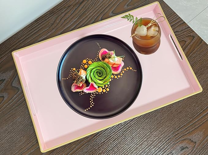 - Design: The size of the Pink tray is 15.7 x 11.8 inches, and it has two built-inhandles for easy carrying. lt has asimple, solid color finish with agolden top rim accent, and theedges are relatively smooth.