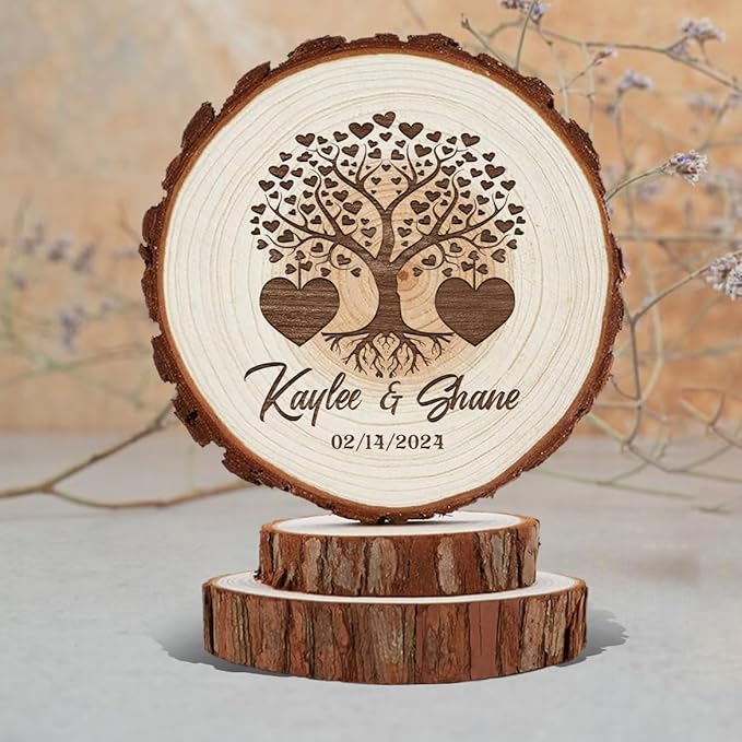 - CUSTOMIZATION: Personalized with names and date laser engraved on natural wood slice, featuring a beautiful heart tree design for a unique wedding, anniversary, birthday, baby shower keepsake. It can also be a table card, and as a companion gift souvenir to family, friends, groomsmen and bridesmaids, and the newlyweds themselves