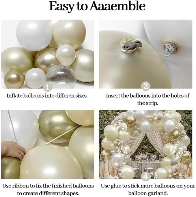 - Easy to Assemble:Our white sand gold balloon arch kit includes three handy tools: Balloon strips, curling ribbon and glue points, to make assembly a breeze. Inflate the balloons and attach them to the balloon strip, mixing colors and sizes for a stunning beige white gold balloon garland effect. Use the dispensing to secure smaller balloons to larger ones, creating a beautiful party backdrop that is sure to impress.Come and design your own balloon arch with your family!