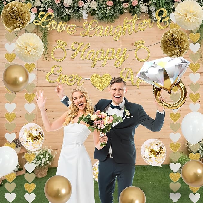 - 📦 engagement decorations kit contains everything you need: a romantic "Love Laughter & Happy Ever After" engagement party sign, 8 eye-catching 12-inch latex balloons (4 light gold metal, 4 white matte, 4 transparent gold glitter), a dazzling 68x61cm gold diamond ring foil balloon, 6 elegant gold paper cupcake toppers, 1 chic gold large cake topper, 4 fluffy 10-inch paper pompoms (2 beige, 2 khaki), and a delightful 2m heart tassel garland—totaling 22 high-quality pieces to transform your space effortlessly.