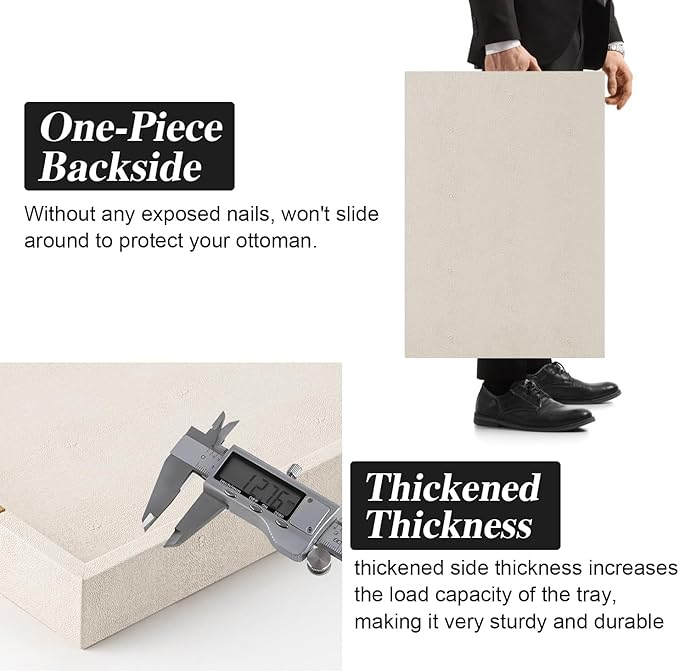 - Durable Leather Tray: Our trays are exquisitely crafted with high-end gold handles,The structure is made of 12mm thick medium density fiberboard, which is very sturdy and lightweight.The surface is made of gorgeous pearl cross grain leather, rich in rich textures, which looks very gorgeous and soft and smooth, and will not hook onto the surface of your footstool or other furniture.