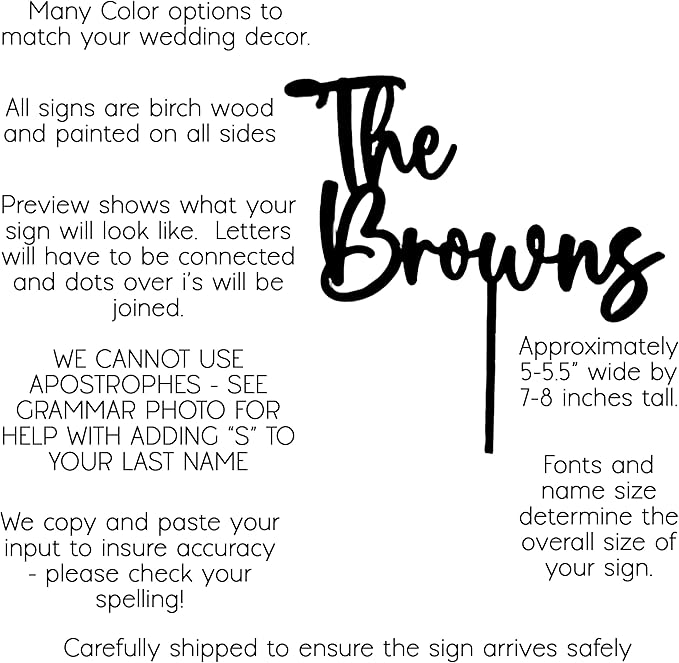 - Preview Available: When ordering our preview shows you what your sign will look like. Keep in mind, all letters will be connected. We place the pick (the part that goes into the cake) where the strongest part of the sign would be to prevent breakage. These signs can be fragile, so be extra careful when unboxing.
